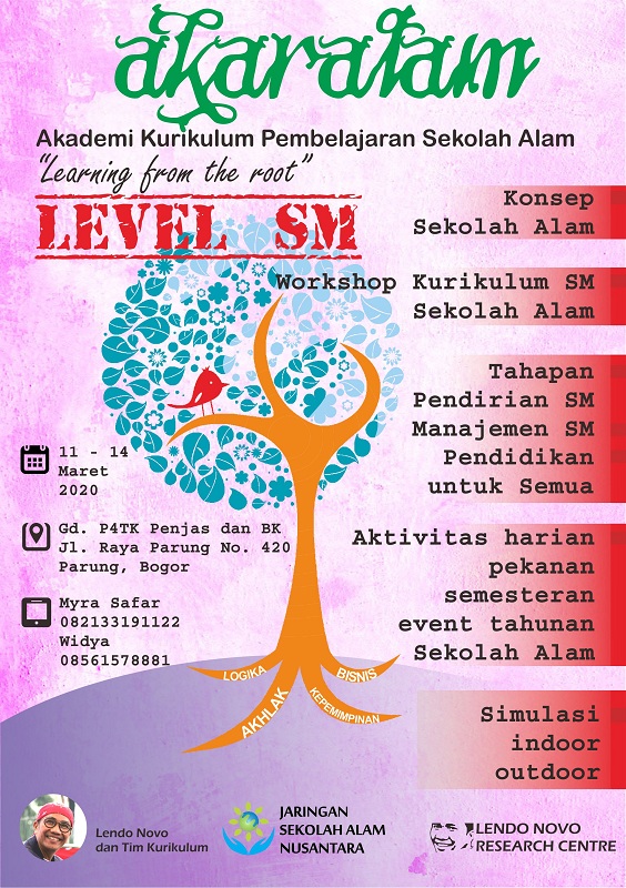 Workshop akaralam SM insyaAllah akan dilaksanakan pada tanggal 11 hingga 14 Maret 2020 bertempat di Gd. Aula P4TK dan Penjas, Parung Bogor. Adapun materi yang akan diberikan adalah openmind dan konsep sekolah alam khususnya untuk SM, Kurikulum SM Sekolah Alam, dan materi kemanajemen-an seperti tahapan pendirian SM, Manajemen SM, dan Pendidikan untuk semua.