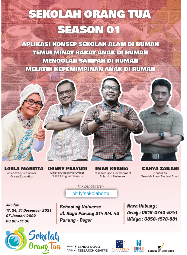 Dimulai pada bulan Desember 2021 yang lalu, Sekolah Orang Tua dimulai dari penyampaian konsep sekolah alam, dilanjutkan dengan menemukan bakat dan minat anak, mengolah sampah, dan melatih kepemimpinan anak. Semua topik tersebut dalam konteks dilakukan orang tua di rumah bersama anak-anaknya. Kegiatan sekolah orang tua akan dilaksanakan rutin perminggu hingga orang tua dalam memahami dan dapat mengimplementasikan konsep sekolah alam di rumah dari A sampai Z. Semoga program ini dapat bermanfaat tidak hanya bagi orang tua yang menyekolahkan anaknya di Sekolah Alam, namun bagi semua orang tua yang ingin bergabung dan mengikuti program ini.