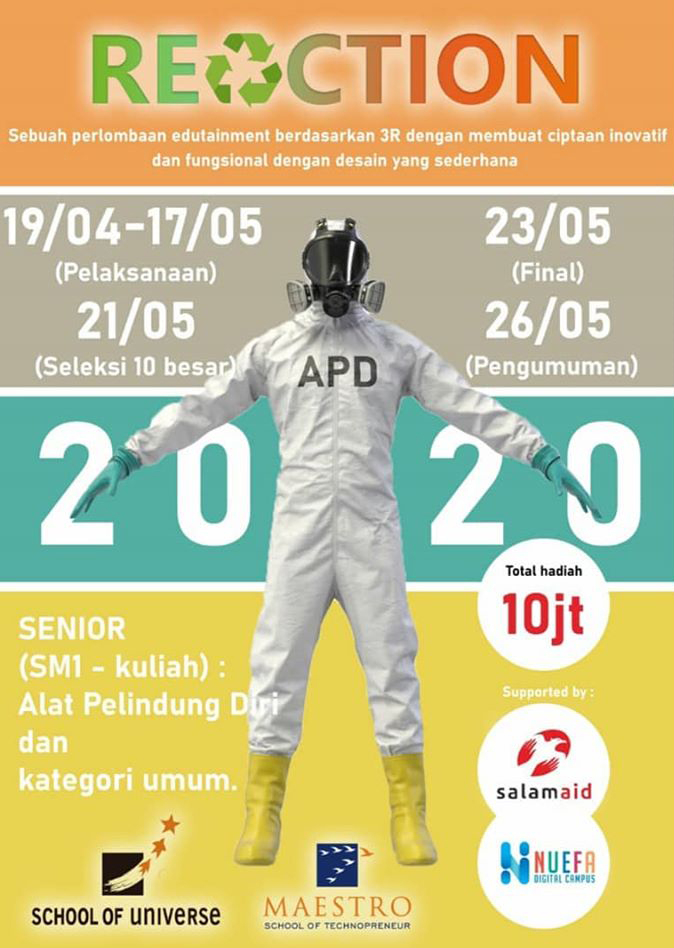 Re-action awalnya adalah acara rutin tahunan di School of Universe, namun karena kondisi School from Home (SFH), acara ini digelar secara online. Pengerjaan project oleh pesertapun dilakukan dirumah masing-masing. Tentunya orang tua boleh membantu karena ini juga menjadi tujuan kurikulum SFH School of Universe, yakni Orang tua berperan menjadi guru bagi anak-anaknya di rumah. Proses penjurianpun dilakukan secara online dimana peserta mempresentasikan langsung di depan para juri. Tiga orang Juri yang dipilih bukan sembarangan, karena mereka merupakan pakar dibidangnya masing-masing. Ada Prof. Herman yang merupakan dosen Fakultas Teknik Universitas Indonesia, Pak Rudi Farid yang merupakan maestro di bidang desain produk, serta Kak Firdaus seorang alumni School of Universe dan Maestro School of Technopreneur yang sukses menjalankan bisnisnya.