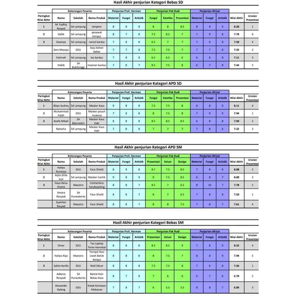 Proses penyisihan hingga final berlangsung mulai 19 April 2019 hingga 17 Mei 2020. Berikut hasil penilaian juri serta para pemenang kompetisi re-action daring 2020. Penilaian didasarkan pada aspek fungsi (fungsi prioritas utama dari suatu produk ,design follow the function), aspek Material Science, (material yg digunakan sebisa mungkin dari barang bekas dan material yg tidak berbahaya bagi tubuh kita), dan aspek artistik (design dan keindahan menjadi kriteria penilaian juga sehingga produk enak dilihat dan mempunyai value yang tinggi). Siapa saja dan dari Sekolah mana yang menjadi pemenang ? Tentunya semua adalah pemenang, karena semua memberikan ide terbaiknya dan juga menginspirasi kita semua. Namun ada kalanya perlombaan memunculkan nama para Juara, sehingga para juri memberikan penilaiannya dengan seksama