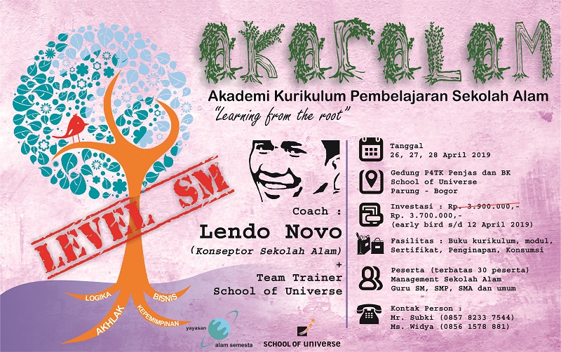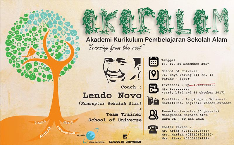 Bulan Desember yang akan datang, tepatnya pada tanggal 18, 19 dan 20 Desember 2017, School of Universe, di bawah naungan Yayasan Alam Semesta menyelenggarakan pelatihan yang dikhususkan pada konten Kurikulum Sekolah Alam. Di sampaikan langsung oleh konseptor sekolah alam Bang Lendo Novo dan tim kurikulum, pelatihan 3 hari dirasa akan sangat kurang mengingat pembahasan kurikulum yang sangat banyak mulai dari tingkat TK hingga SD. Namun diharapkan hadirnya kurikulum Sekolah Alam dapat mencerahkan pendidikan Indonesia khususnya pendidikan berbasis akhlak, karakter, logika dan bisnis. Jangan lupa untuk mendaftar secepatnya karena peserta hanya akan dibatasi 30 orang saja.