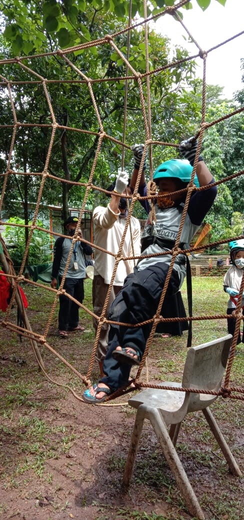Selesai memasang tenda dilanjutkan dengan snack time dan berlanjut ke kegiatan outbound. Untuk kegiatan outbound yang pertama yaitu tracking. Tracking kali ini kita hanya berkeliling di sekitar lingkungan SoU sambil mengenal dan mempelajari tumbuhan-tumbuhan yang ada di SoU sambil menyuarakan yel-yel yang dibuat oleh masing-masing kelompok, wahhhh sangat mengasikkan kan tentunya. Nahhh setelah tracking teman-teman diminta untuk istirahat, shalat duhur dan makan siang, selesai ishoma teman-teman melanjutkan kegiatannya, yaitu outbound, kali ini outboundnya adalah two line bridge dan landing net. Disini teman-teman dilatih keberaniannya dan konsentrasinya. Oh iya perlu diketahui teman-teman bahwa setelah selesai dan sebelum kegiatan seluruh area yang kita gunakan di semprot oleh disinfektan.