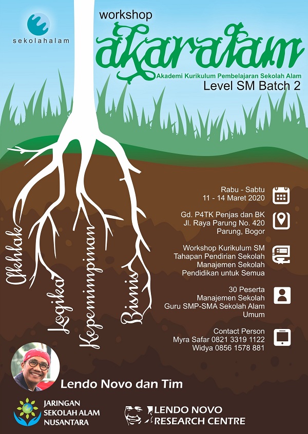 Workshop akaralam SM insyaAllah akan dilaksanakan pada tanggal 11 hingga 14 Maret 2020 bertempat di Gd. Aula P4TK dan Penjas, Parung Bogor. Adapun materi yang akan diberikan adalah openmind dan konsep sekolah alam khususnya untuk SM, Kurikulum SM Sekolah Alam, dan materi kemanajemen-an seperti tahapan pendirian SM, Manajemen SM, dan Pendidikan untuk semua.